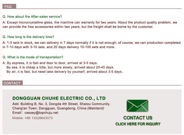 A: Except microcrystalline glass, the machine can warranty for two years. About the product quality problem, we can provide the free accessories within two years, but the freight shall be borne by the customer.